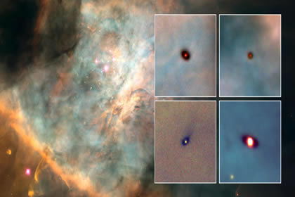 Stars are born in clouds of gas and dust. One such stellar nursery is the Orion Nebula, an enormous cloud of gas and dust many light-years across. Turbulence from deep within these clouds creates high density regions called knots. These knots contain sufficient mass that the gas and dust can begin to collapse from gravitational attraction. As it collapses, pressure from gravity causes the material at the center to heat up, creating a protostar. One day, this core becomes hot enough to ignite fusion and a star is born. Not all of the material in the collapsing cloud ends up as part of a star — the remaining dust can become planets, asteroids or comets … or it may remain as dust. Scientists running three-dimensional computer models of star formation predict that the spinning clouds of collapsing gas and dust may break up into two or three distinct blobs. This would explain why the majority the stars in the Milky Way are paired or in groups of multiple stars.